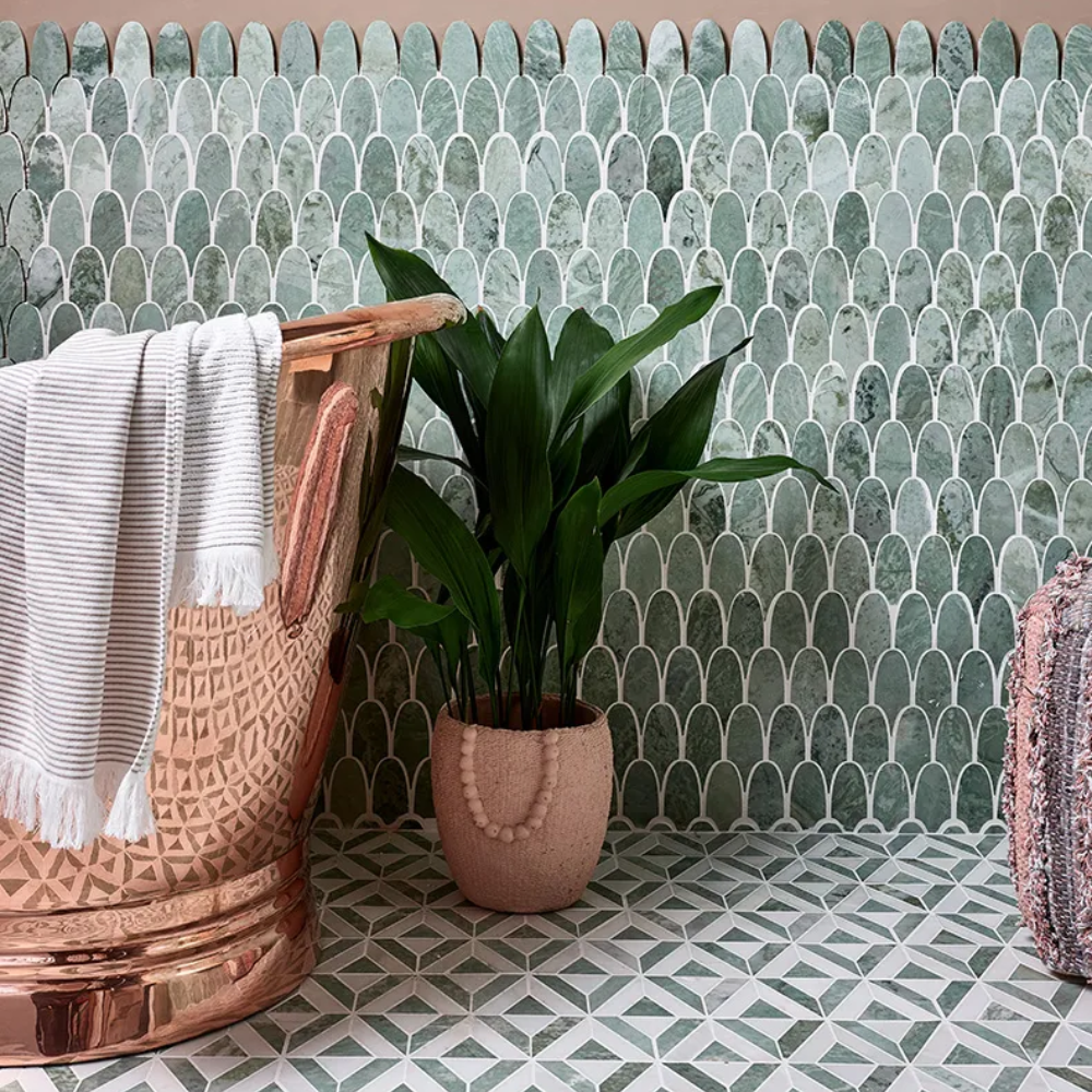 This marble mosaic collection is inspired by the beautiful plumage of Indian peafowls and is available in two definitive and timeless colours.