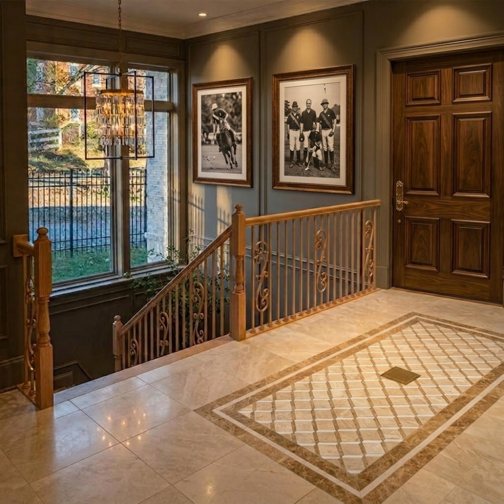 Pierwsze wrażenie tworzy się w przedpokoju. Mozaika geometryczna z marmuru na ścianie wejściowej to sygnał dla każdego gościa: jesteś w miejscu, gdzie detal ma znaczenie. Wzór Steps działa tu jak architektoniczny element — strukturyzuje przestrzeń, nadaje jej kierunek i głębię.