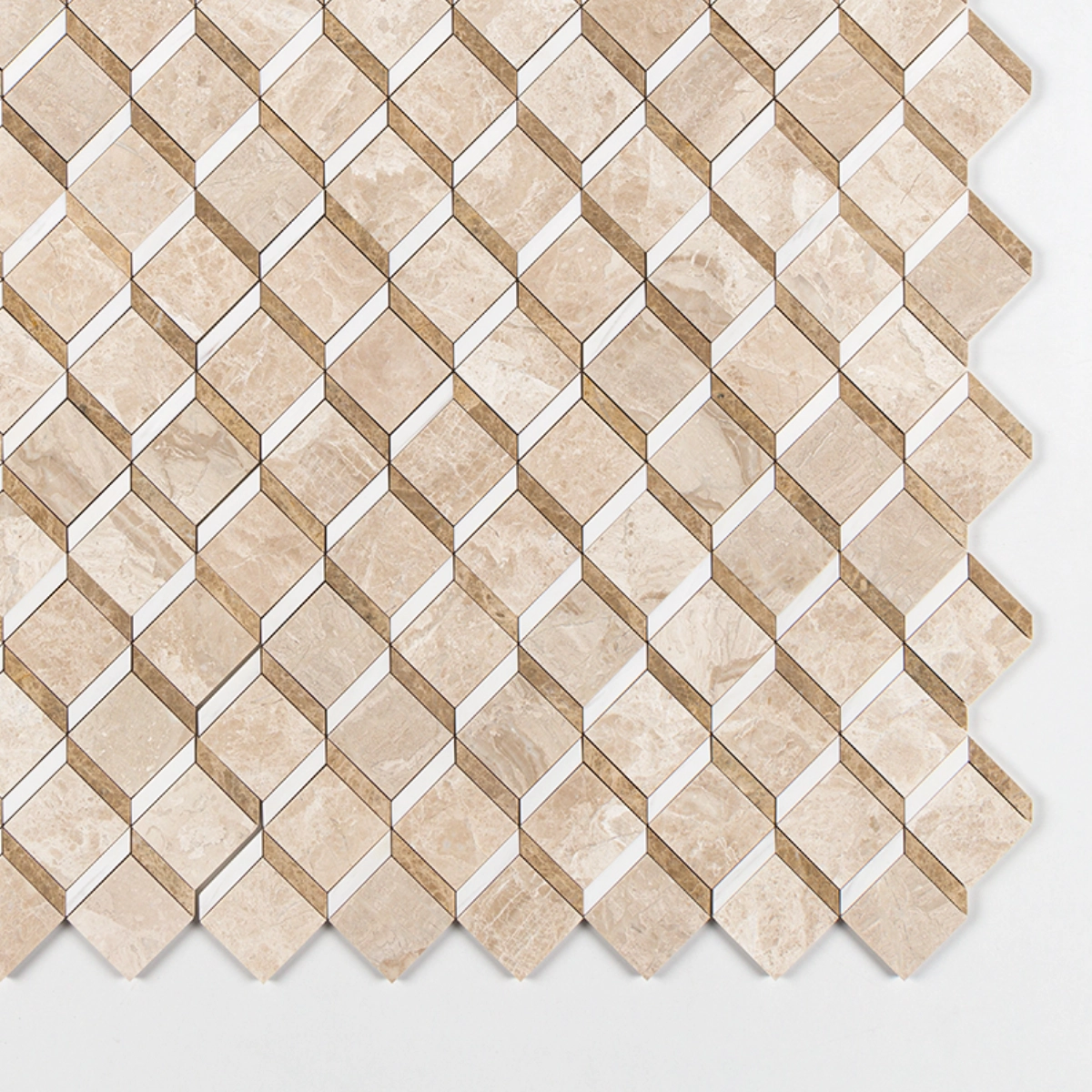 Są wzory, które od pierwszego spojrzenia przyciągają i nie pozwalają oderwać wzroku. Mozaika marmurowa Diana Royal Steps należy właśnie do tej kategorii — geometryczny wzór rombów tworzący złudzenie trójwymiarowości, trzy odcienie naturalnego marmuru w jednej, precyzyjnie skomponowanej mozaice. Kremowy beż, ciepły brąz, klasyczna biel. Trzy marmury. Jedna kompozycja. Efekt, który robi wrażenie.