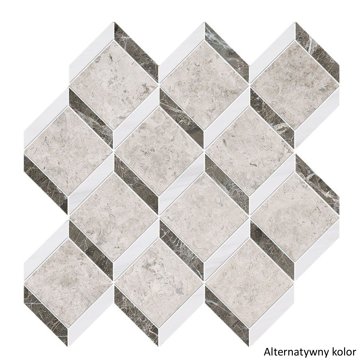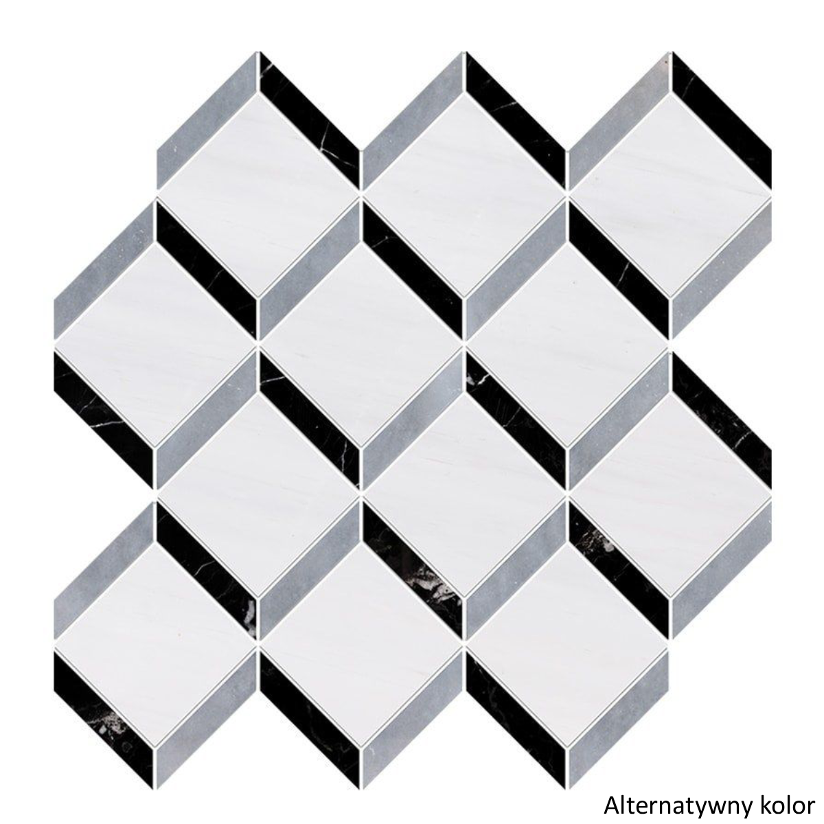 Inne mozaiki Diana — poza wzorem Steps oferujemy inne kompozycje z tego samego marmuru: mozaiki heksagonalne, paski, wzory klasyczne. Możliwość łączenia różnych mozaik w jednej przestrzeni, przy zachowaniu jednorodności koloru i faktury kamienia.