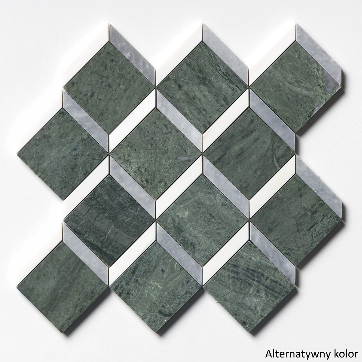 To nie przypadkowe zestawienie kolorów. To przemyślana gra świateł i faktur, w której każdy element mozaiki pełni swoją rolę — jasne romby wysuwają się ku przodowi, ciemniejsze pasy modelują głębię, białe akcenty nadają rytm całości. Gotowy wzór żyje na ścianie — zmienia się wraz z kierunkiem padania światła, o poranku wygląda inaczej niż wieczorem. Tak zachowuje się wyłącznie kamień naturalny.
